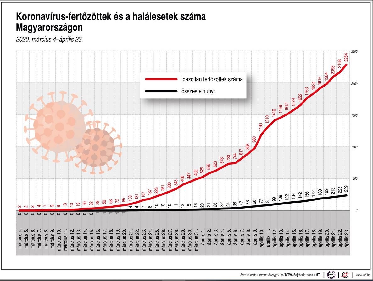 Budapest, 2020. április 23., csütörtök (MTI) - Meghalt 14 idős krónikus beteg, és 116-tal, 2284-re emelkedett az azonosított koronavírus-fertőzöttek száma Magyarországon - közölte a koronavirus.gov.hu csütörtök reggel.