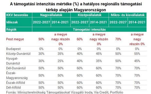 Az Európai Bizottság 2021. április 19-én fogadta el a 2022–2027-es időszakra szóló regionális támogatási iránymutatások felülvizsgálatát és ennek alapján - amint azt a Portfolio is megírta - szeptember 16-án az első tagállamok között fogadta el Magyarország regionális támogatási térképét is – emlékeztet közleményében a Via Credit. A regionális támogatás célja az egyes régiók gazdasági leszakadásának megakadályozása, felzárkóztatásuk elősegítése. A térkép meghatározza a regionális állami beruházási támogatásra jogosult, leghátrányosabb helyzetben lévő magyar régiókat és azok támogatási mértékét.